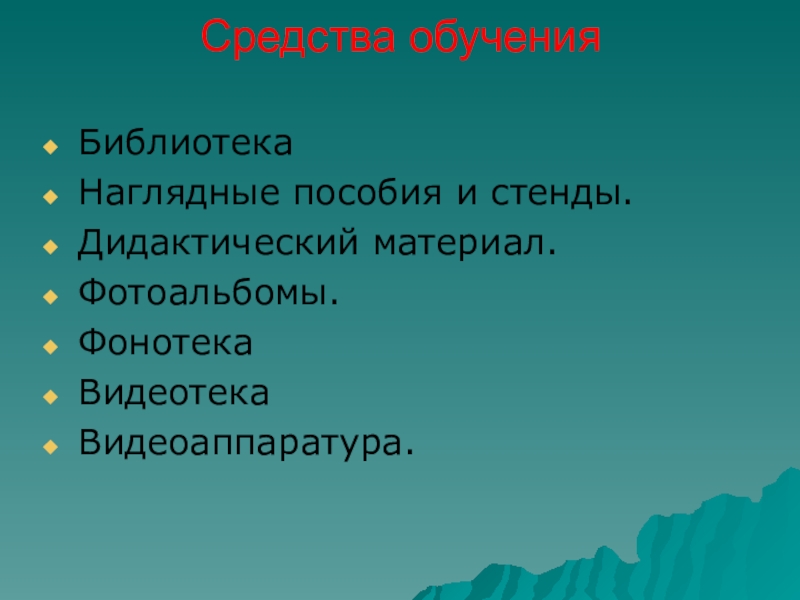 Средства обучения БиблиотекаНаглядные пособия и стенды.Дидактический материал.Фотоальбомы.ФонотекаВидеотекаВидеоаппаратура.