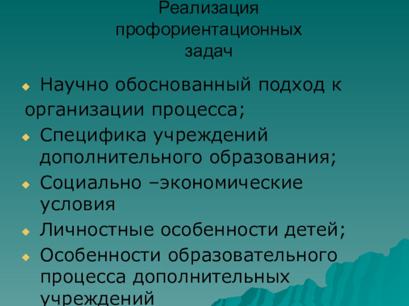 Реализация  профориентационных  задач Научно обоснованный подход корганизации процесса;Специфика учреждений дополнительного образования;Социально –экономические условияЛичностные особенности детей;Особенности