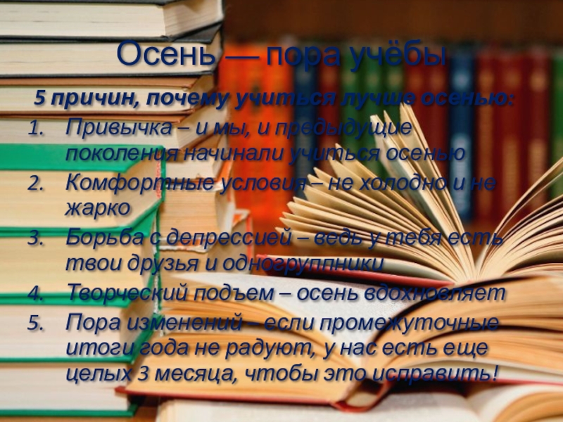 Осень — пора учёбы5 причин, почему учиться лучше осенью:Привычка – и мы, и предыдущие поколения начинали учиться