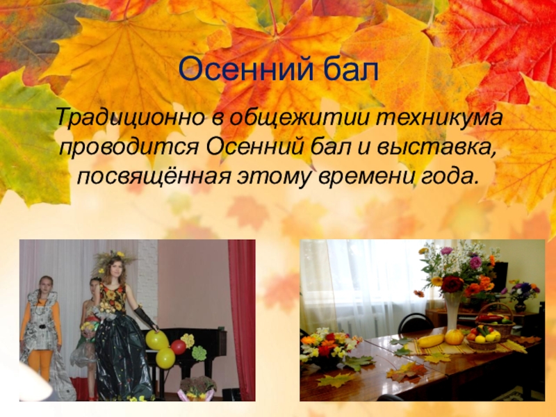 Осенний балТрадиционно в общежитии техникума проводится Осенний бал и выставка, посвящённая этому времени года.