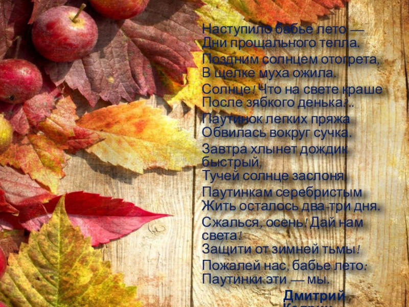 Слайд 2Наступило бабье лето — Дни прощального тепла.