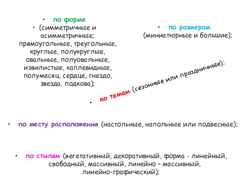 по стилям (вегетативный, декоративный, форма - линейный, свободный, массивный, линейно – массивный,