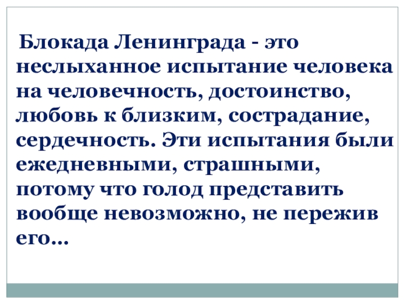 Слайд 3 Блокада Ленинграда - это неслыханное испытание человека на человечность,