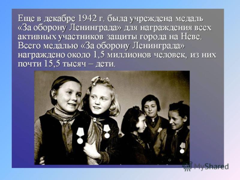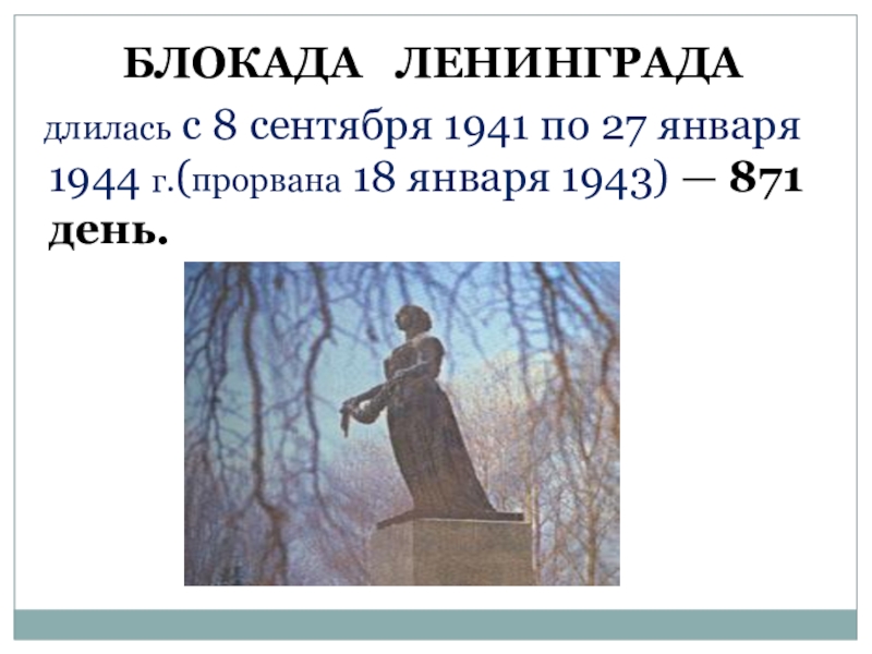 БЛОКАДА ЛЕНИНГРАДА длилась с 8 сентября 1941 по 27 января 1944 г.(прорвана 18 января 1943) — 871 день.