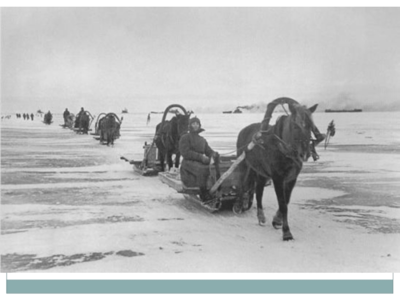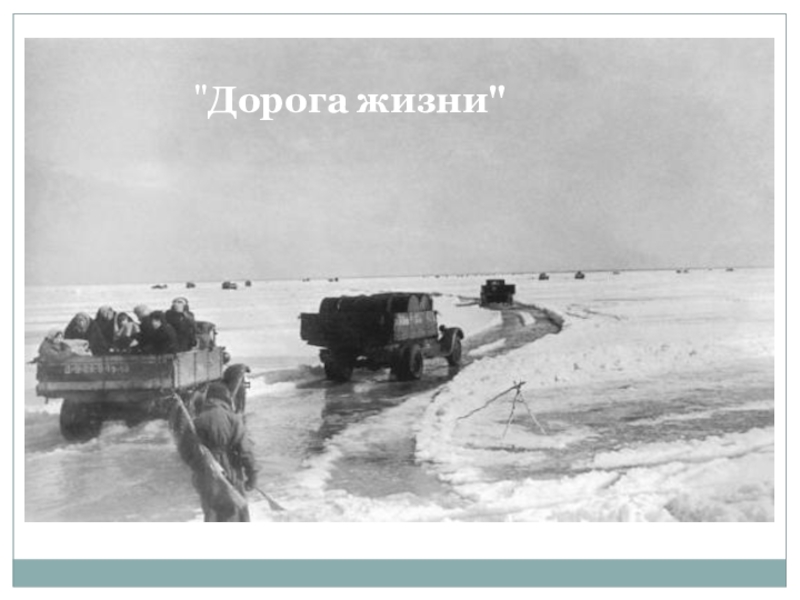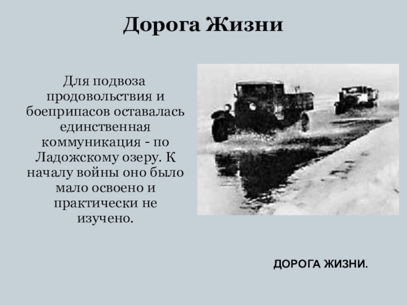 Дорога Жизни   Для подвоза продовольствия и боеприпасов оставалась единственная коммуникация - по Ладожскому озеру. К