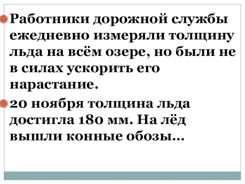 Слайд 11Работники дорожной службы ежедневно измеряли толщину льда на всём озере, но