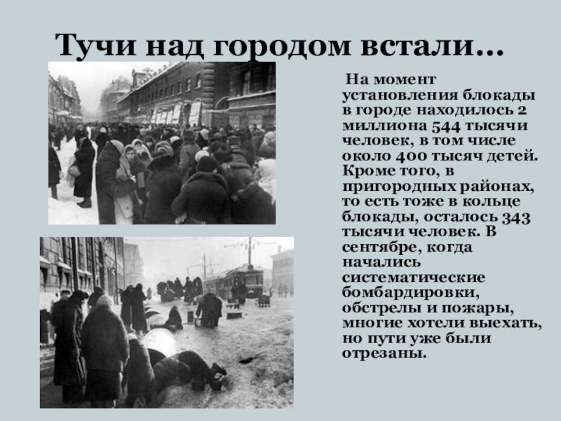 Тучи над городом встали...    На момент установления блокады в городе находилось 2 миллиона 544