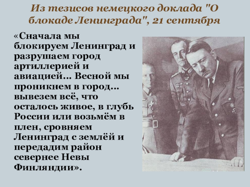 Слайд 4 Из тезисов немецкого доклада "О блокаде Ленинграда", 21 сентября