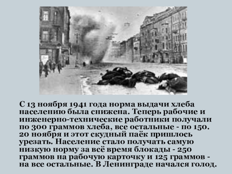населению была снижена. Теперь рабочие и инженерно-технические работники получали по 300 граммов хлеба, все остальные - по 150. 20 ноября и этот скудный паёк пришлось урезать. Население стало получать самую низкую норму за всё время блокады - 250 граммов на рабочую карточку и 125 граммов - на все остальные. В Ленинграде начался голод.