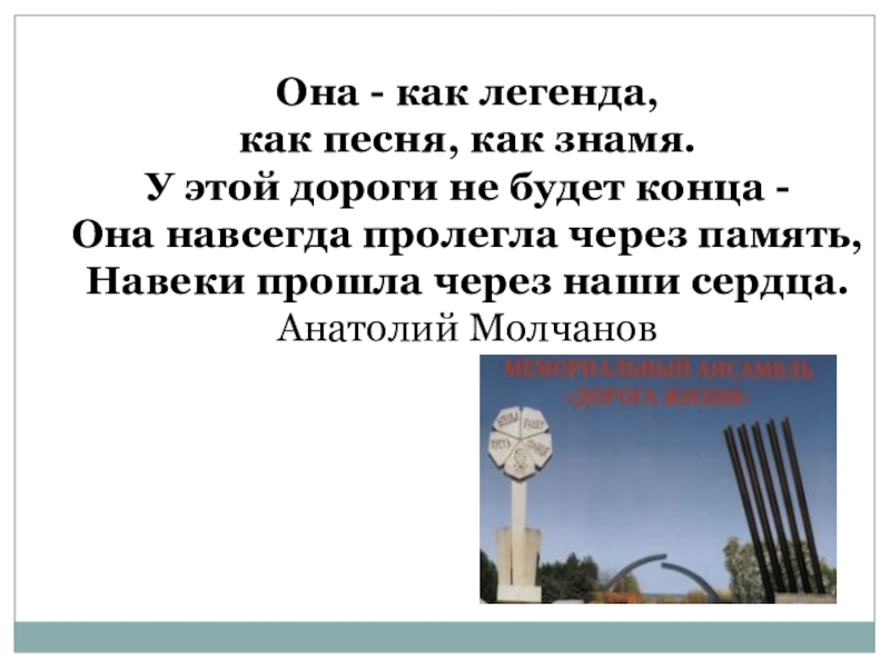 Слайд 15Она - как легенда, как песня, как знамя. У этой дороги не