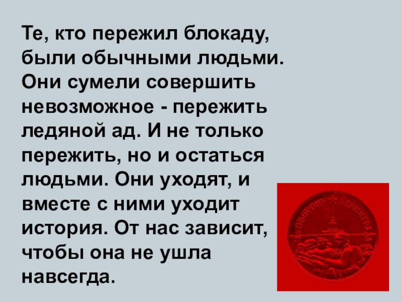Слайд 51Те, кто пережил блокаду, были обычными людьми. Они сумели совершить невозможное