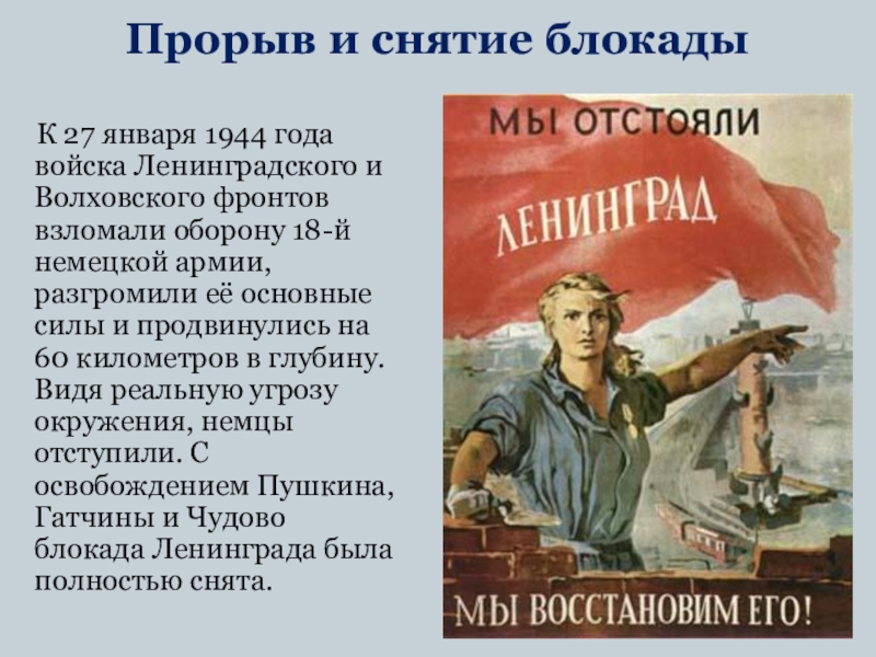 Прорыв и снятие блокады   К 27 января 1944 года войска Ленинградского и Волховского фронтов взломали