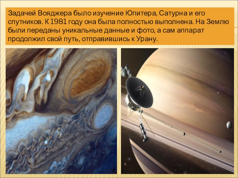 Слайд 5Задачей Вояджера было изучение Юпитера, Сатурна и его спутников. К 1981