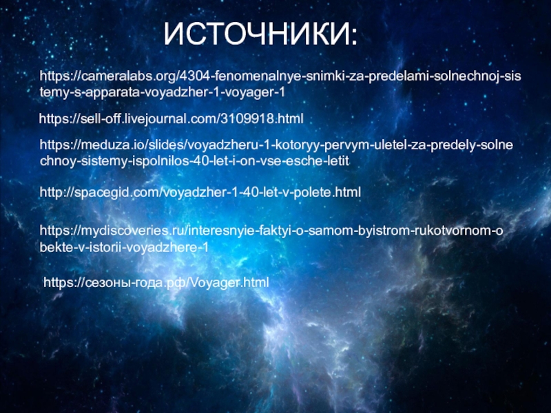ИСТОЧНИКИ:https://cameralabs.org/4304-fenomenalnye-snimki-za-predelami-solnechnoj-sistemy-s-apparata-voyadzher-1-voyager-1 https://sell-off.livejournal.com/3109918.htmlhttps://meduza.io/slides/voyadzheru-1-kotoryy-pervym-uletel-za-predely-solnechnoy-sistemy-ispolnilos-40-let-i-on-vse-esche-letithttp://spacegid.com/voyadzher-1-40-let-v-polete.htmlhttps://mydiscoveries.ru/interesnyie-faktyi-o-samom-byistrom-rukotvornom-obekte-v-istorii-voyadzhere-1https://сезоны-года.рф/Voyager.html