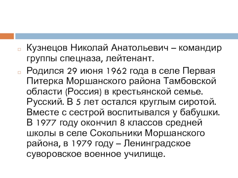 Слайд 2Кузнецов Николай Анатольевич – командир группы спецназа, лейтенант.