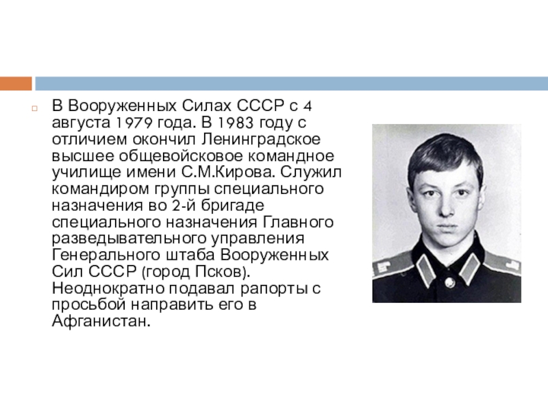 году с отличием окончил Ленинградское высшее общевойсковое командное училище имени С.М.Кирова. Служил командиром группы специального назначения во 2-й бригаде специального назначения Главного разведывательного управления Генерального штаба Вооруженных Сил СССР (город Псков). Неоднократно подавал рапорты с просьбой направить его в Афганистан.
