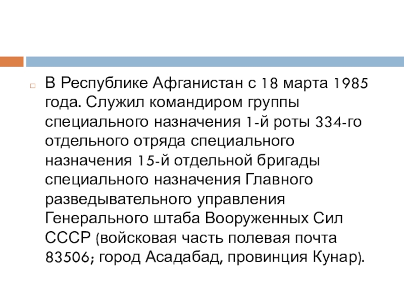 Слайд 4В Республике Афганистан с 18 марта 1985 года. Служил командиром группы