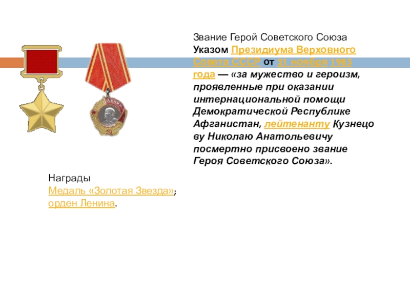 Слайд 12Звание Герой Советского Союза Указом Президиума Верховного Совета СССР от 21 ноября 1985 года — «за мужество