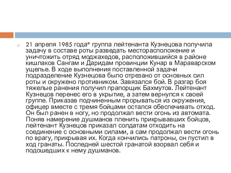 Слайд 521 апреля 1985 года* группа лейтенанта Кузнецова получила задачу в составе