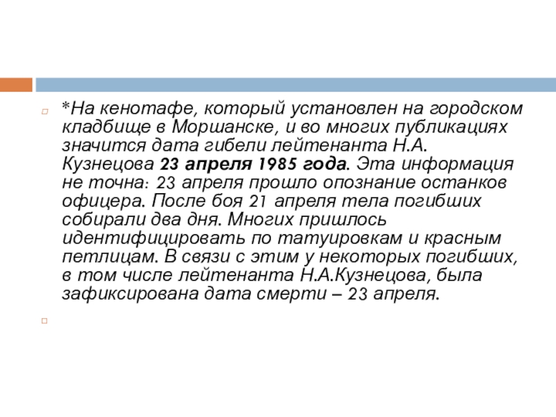 многих публикациях значится дата гибели лейтенанта Н.А.Кузнецова 23 апреля 1985 года. Эта информация не точна: 23 апреля прошло опознание останков офицера. После боя 21 апреля тела погибших собирали два дня. Многих пришлось идентифицировать по татуировкам и красным петлицам. В связи с этим у некоторых погибших, в том числе лейтенанта Н.А.Кузнецова, была зафиксирована дата смерти – 23 апреля.