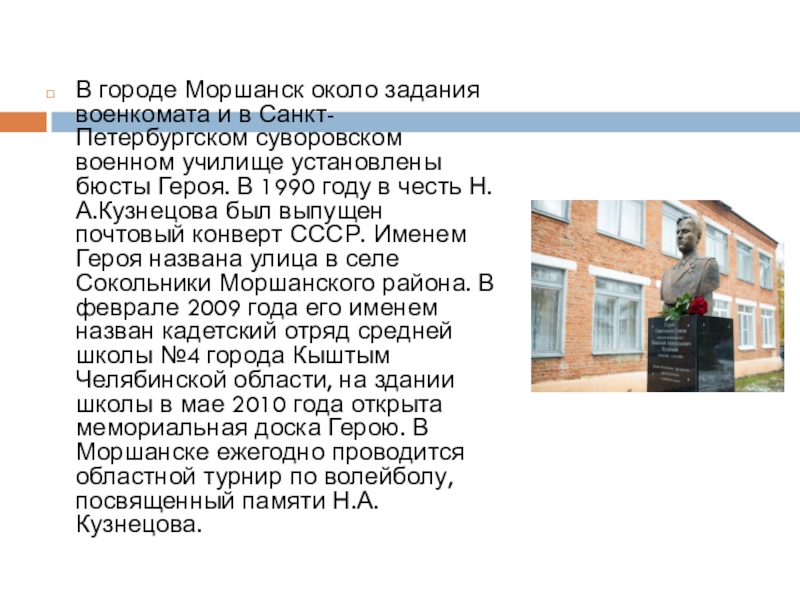 2016 году в память о подвиге уроженца Моршанского района Тамбовской области Н.А. Кузнецова.