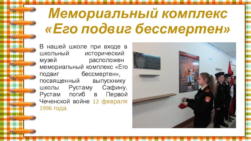 В нашей школе при входе в школьный исторический музей расположен мемориальный комплекс «Его подвиг бессмертен», посвященный выпускнику школы Рустаму Сафину. Рустам погиб в Первой Чеченской войне 12 февраля 1996 года.