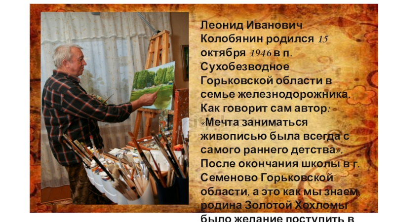 области в семье железнодорожника. Как говорит сам автор: «Мечта заниматься живописью была всегда с самого раннего детства». После окончания школы в г. Семеново Горьковской области, а это как мы знаем, родина Золотой Хохломы было желание поступить в художественное училище или медицинский институт.