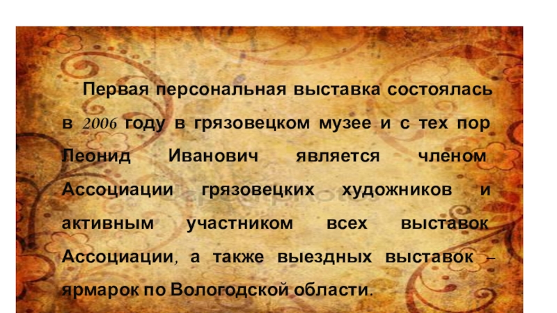 с тех пор Леонид Иванович является членом Ассоциации грязовецких художников и активным участником всех выставок Ассоциации, а также выездных выставок –ярмарок по Вологодской области.