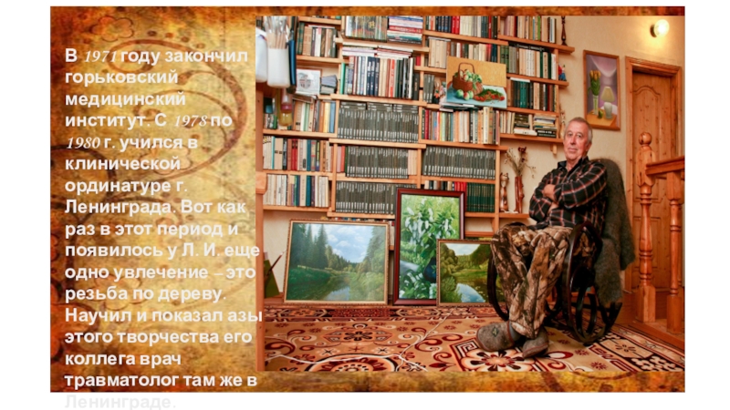 г. учился в клинической ординатуре г. Ленинграда. Вот как раз в этот период и появилось у Л. И. еще одно увлечение – это резьба по дереву. Научил и показал азы этого творчества его коллега врач травматолог там же в Ленинграде. Материал для своих работ брали у одной из бань, где хранились запасы древесины.