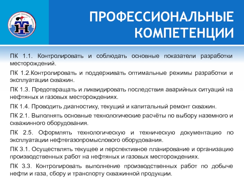 ПК 1.3. Предотвращать и ликвидировать последствия аварийных ситуаций на нефтяных и газовых месторождениях.