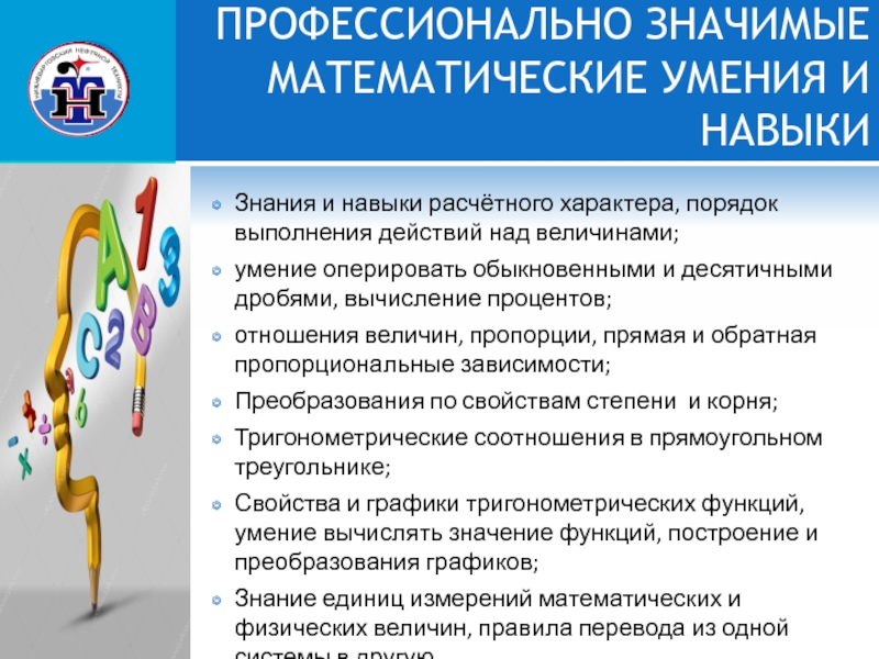 Слайд 9ПРОФЕССИОНАЛЬНО ЗНАЧИМЫЕ МАТЕМАТИЧЕСКИЕ УМЕНИЯ И НАВЫКИ