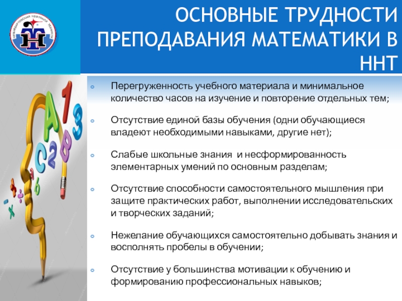 Слайд 10ОСНОВНЫЕ ТРУДНОСТИ ПРЕПОДАВАНИЯ МАТЕМАТИКИ В ННТ