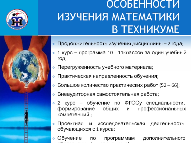 Слайд 7ОСОБЕННОСТИ ИЗУЧЕНИЯ МАТЕМАТИКИ В ТЕХНИКУМЕ