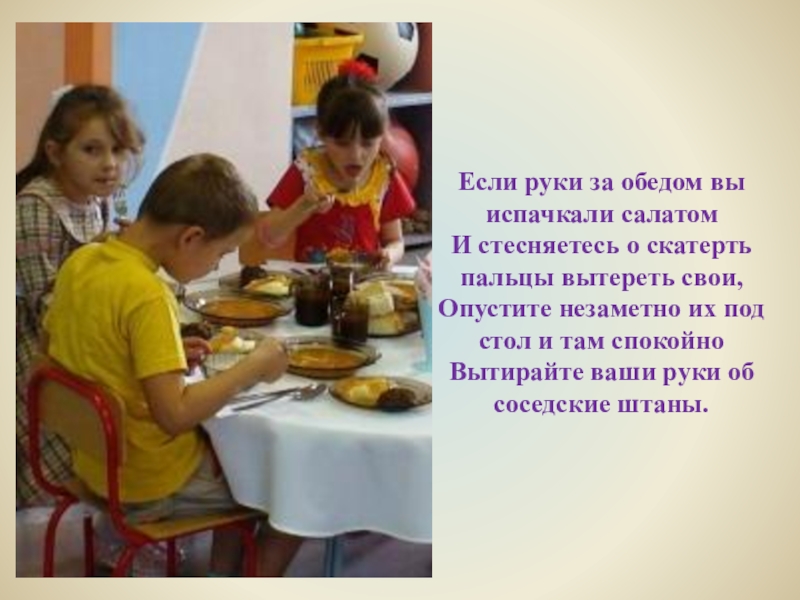 Опустите незаметно их под стол и там спокойно Вытирайте ваши руки об соседские штаны.
