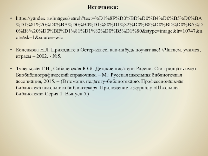 Тубельская Г.Н., Соболевская Ю.Я. Детские писатели России. Сто тридцать имен: Биобиблиографический справочник. – М.: Русская школьная библиотечная ассоциация, 2015. – (В помощь педагогу-библиотекарю. Профессиональная библиотека школьного библиотекаря. Приложение к журналу «Школьная библиотека» Серия 1. Выпуск 5.)