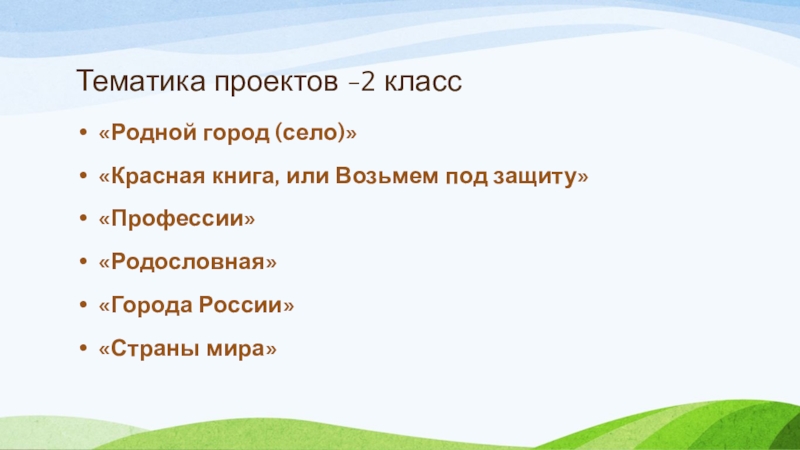 Тематика проектов -2 класс«Родной город (село)»«Красная книга, или Возьмем под защиту»«Профессии»«Родословная»«Города России»«Страны мира»