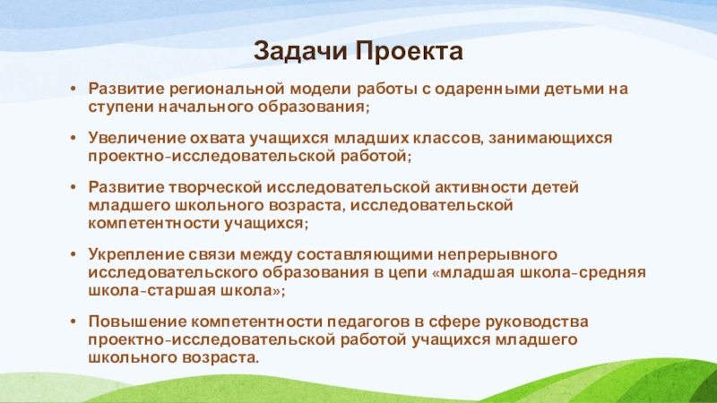 Задачи ПроектаРазвитие региональной модели работы с одаренными детьми на ступени начального образования;Увеличение охвата учащихся младших классов, занимающихся
