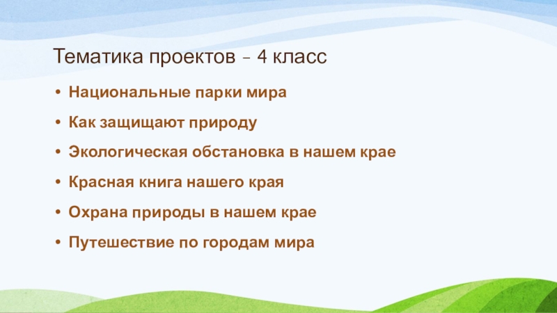 Тематика проектов - 4 классНациональные парки мираКак защищают природуЭкологическая обстановка в нашем краеКрасная книга нашего краяОхрана природы