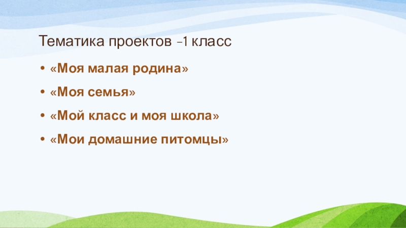 Тематика проектов -1 класс«Моя малая родина»«Моя семья»«Мой класс и моя школа»«Мои домашние питомцы»