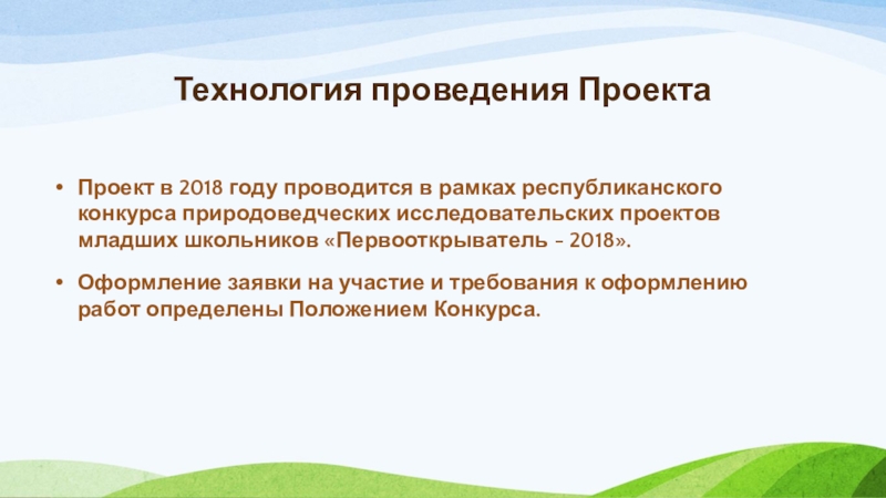 Технология проведения ПроектаПроект в 2018 году проводится в рамках республиканского конкурса природоведческих исследовательских проектов младших школьников «Первооткрыватель