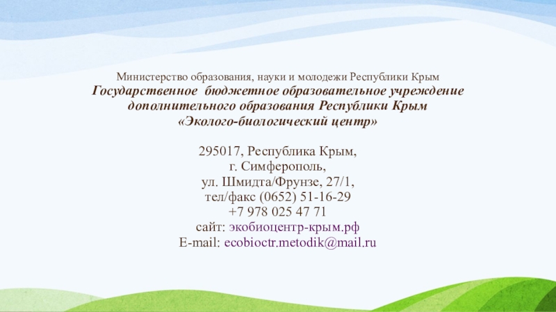 образования Республики Крым «Эколого-биологический центр» 295017, Республика Крым, г. Симферополь, ул. Шмидта/Фрунзе, 27/1, тел/факс (0652) 51-16-29 +7 978 025 47 71 сайт: экобиоцентр-крым.рф E-mail: ecobioctr.metodik@mail.ru