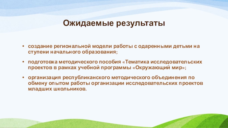 Ожидаемые результатысоздание региональной модели работы с одаренными детьми на ступени начального образования;подготовка методического пособия «Тематика исследовательских проектов