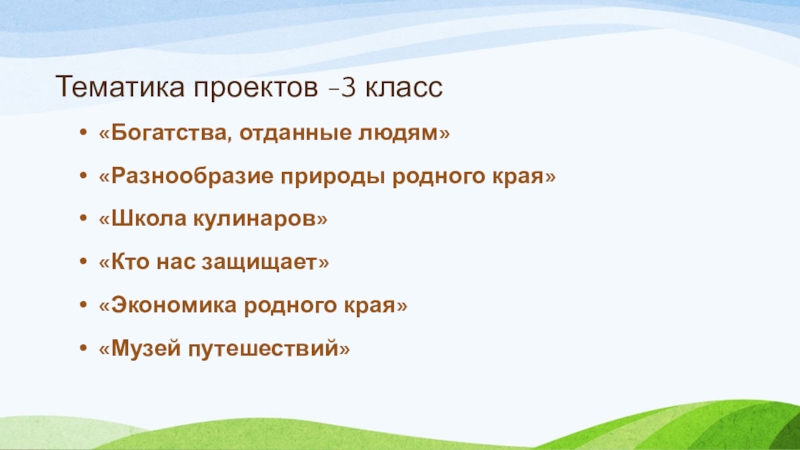 Тематика проектов -3 класс«Богатства, отданные людям»«Разнообразие природы родного края»«Школа кулинаров»«Кто нас защищает»«Экономика родного края»«Музей путешествий»