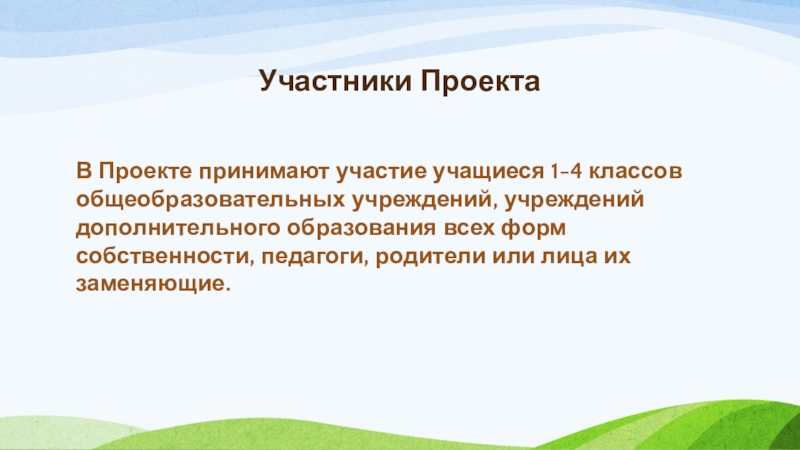 Участники ПроектаВ Проекте принимают участие учащиеся 1-4 классов общеобразовательных учреждений, учреждений дополнительного образования всех форм собственности, педагоги,