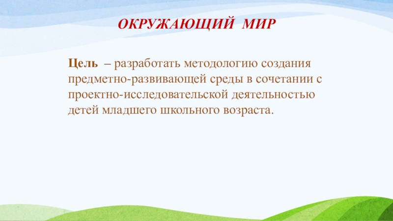 ОКРУЖАЮЩИЙ МИР Цель – разработать методологию создания предметно-развивающей среды в сочетании с проектно-исследовательской деятельностью детей младшего школьного возраста.