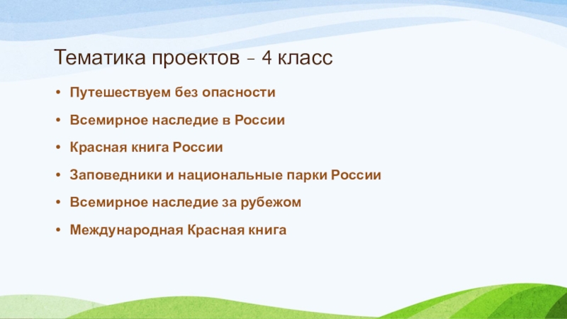 Тематика проектов - 4 классПутешествуем без опасностиВсемирное наследие в РоссииКрасная книга РоссииЗаповедники и национальные парки РоссииВсемирное наследие