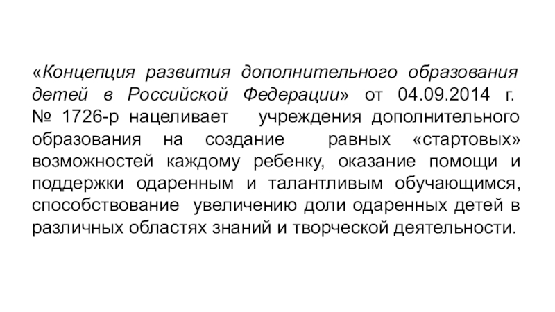№ 1726-р нацеливает учреждения дополнительного образования на создание равных «стартовых» возможностей каждому ребенку, оказание помощи и поддержки одаренным и талантливым обучающимся, способствование увеличению доли одаренных детей в различных областях знаний и творческой деятельности.