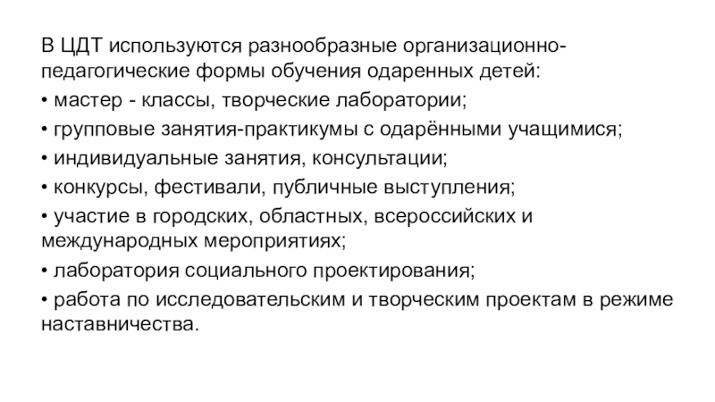 Слайд 14В ЦДТ используются разнообразные организационно-педагогические формы обучения одаренных детей: