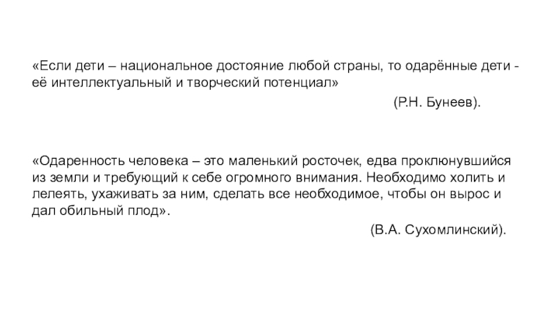 «Одаренность человека – это маленький росточек, едва проклюнувшийся из земли и требующий к себе огромного внимания. Необходимо холить и лелеять, ухаживать за ним, сделать все необходимое, чтобы он вырос и дал обильный плод».