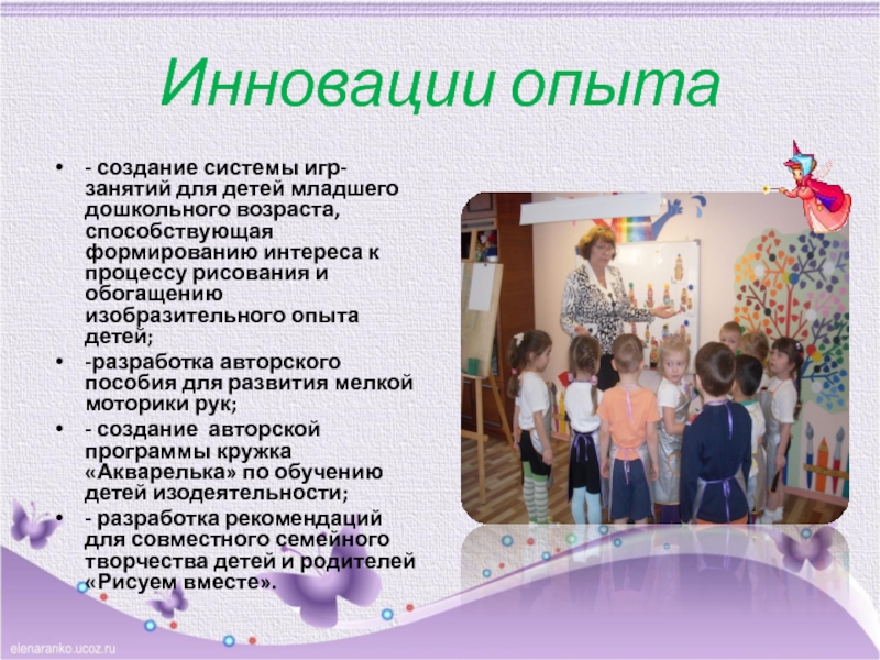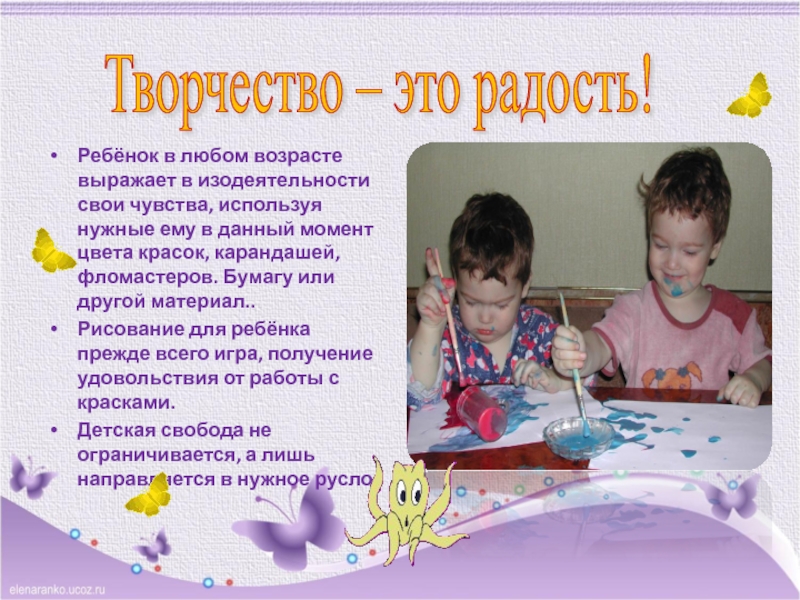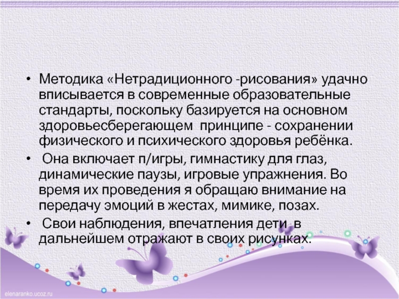 Особенность методики заключается также и в том, что результат изобразительной деятельности не может быть плохим или хорошим, работа каждого ребёнка индивидуальна и неповторима.